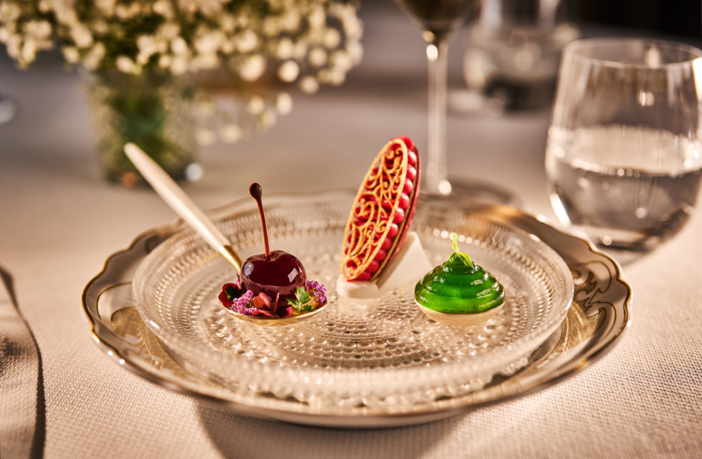 Tredje akt er en perfekt orkestrert trio av desserter, som bringer glede i øynene til betrakteren. Rettene henter sin inspirasjon fra hotellet og Speilsalen’s kjøkkenhage.